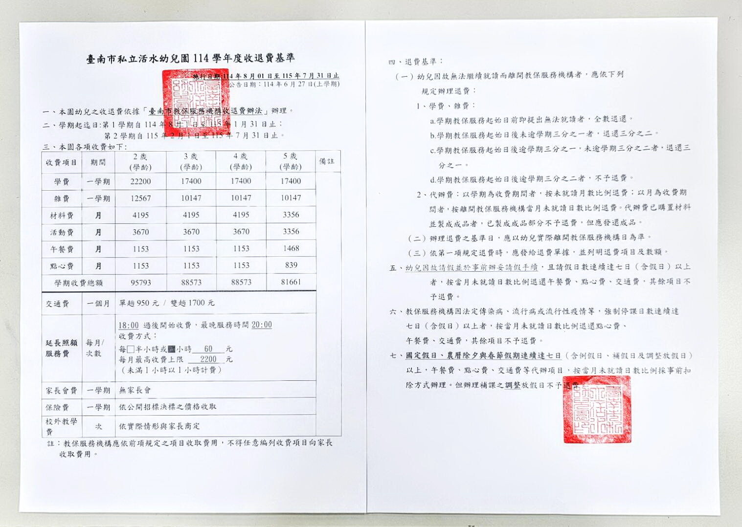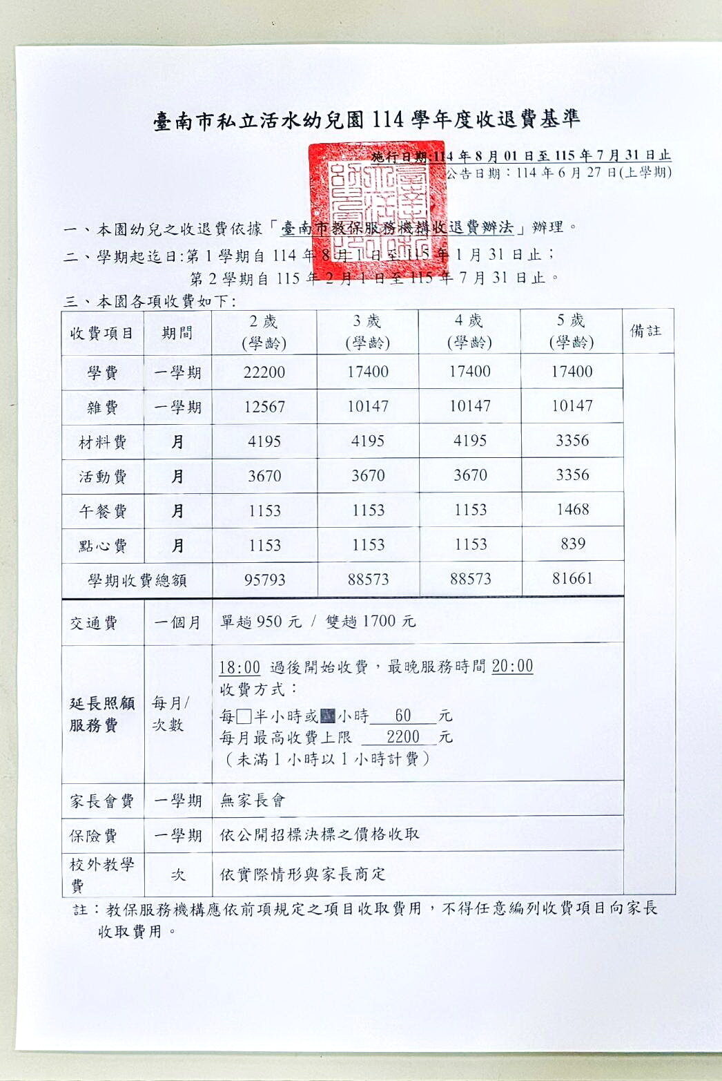 下一篇114學年度臺南市私立活水幼兒園家長每月繳費數額試算表下一篇