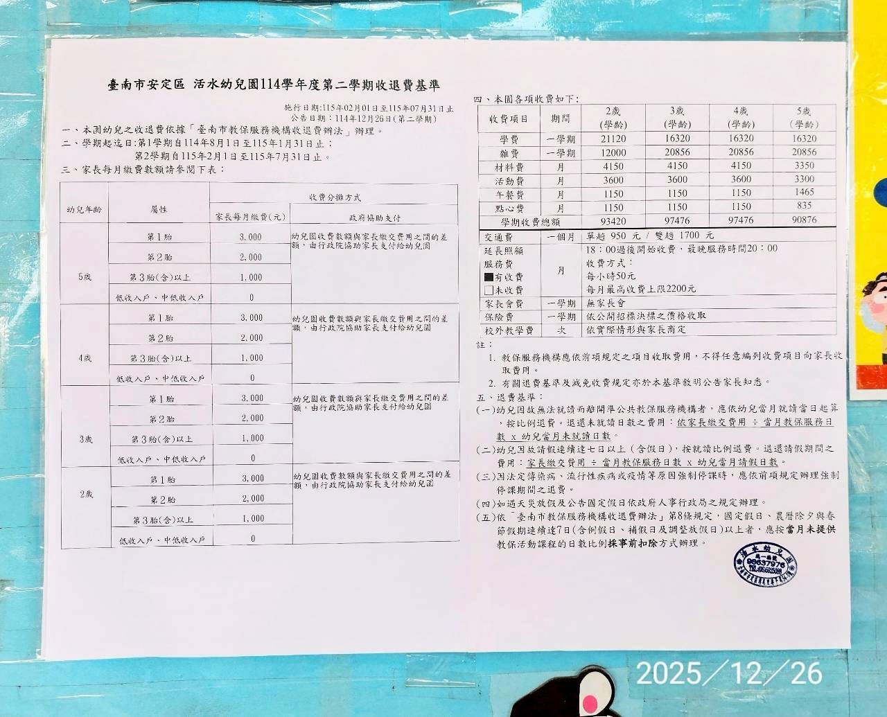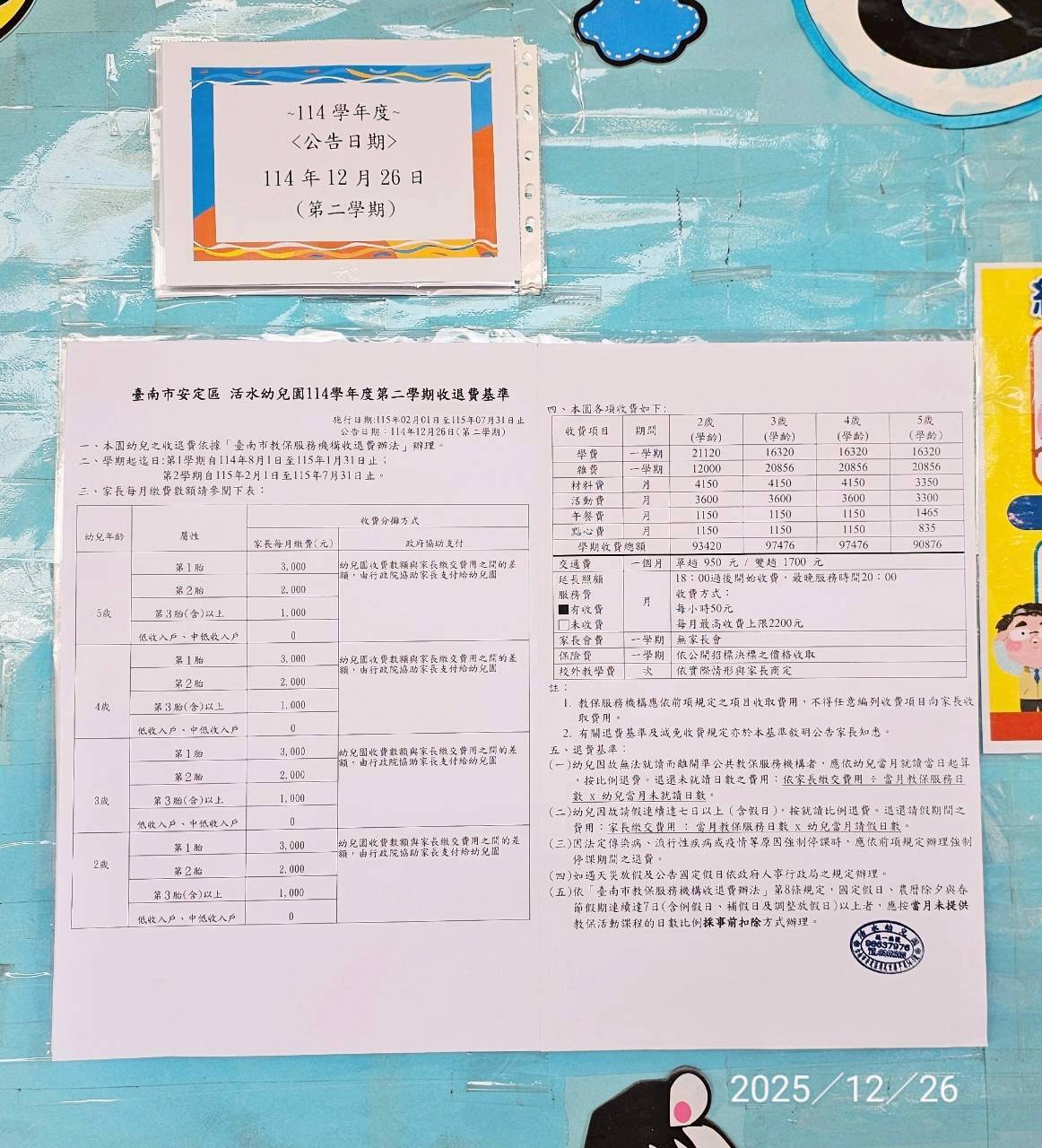 114學年度第二學期收退費基準