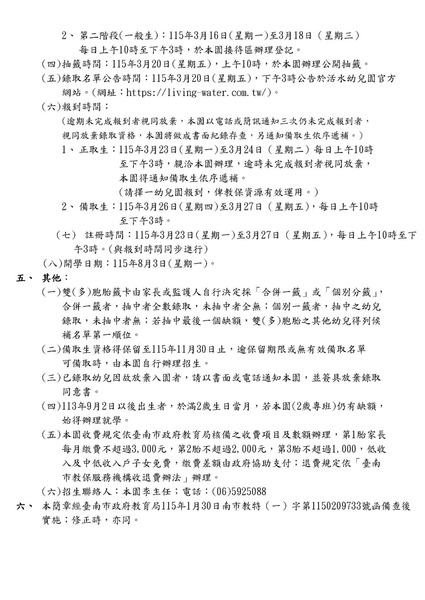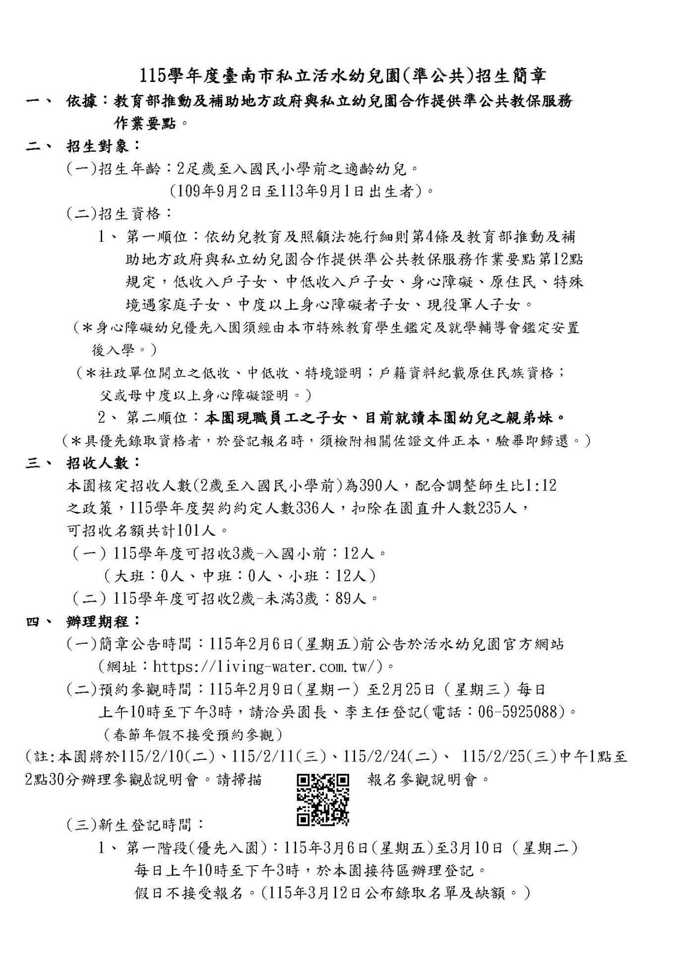 115學年臺南市私立活水幼兒園(準公共)招生簡章
