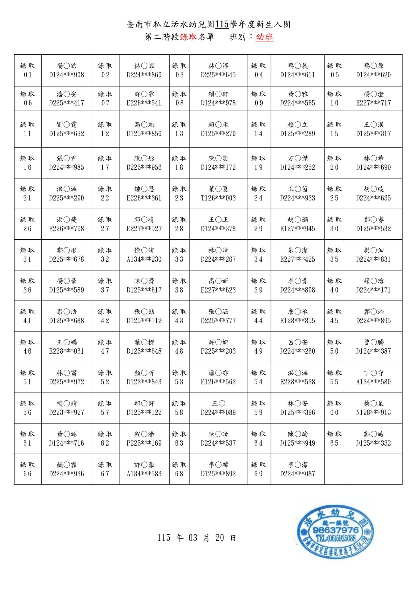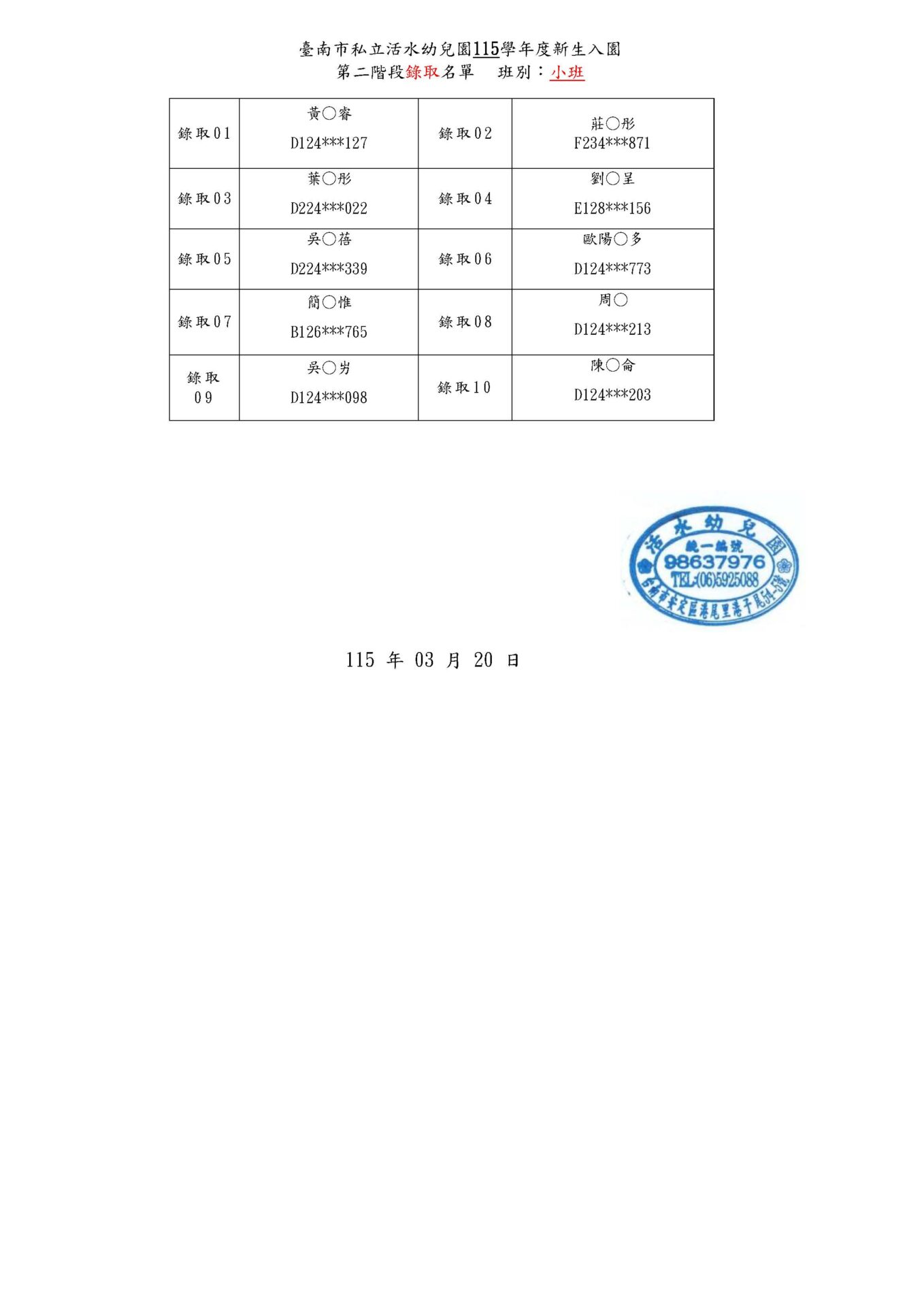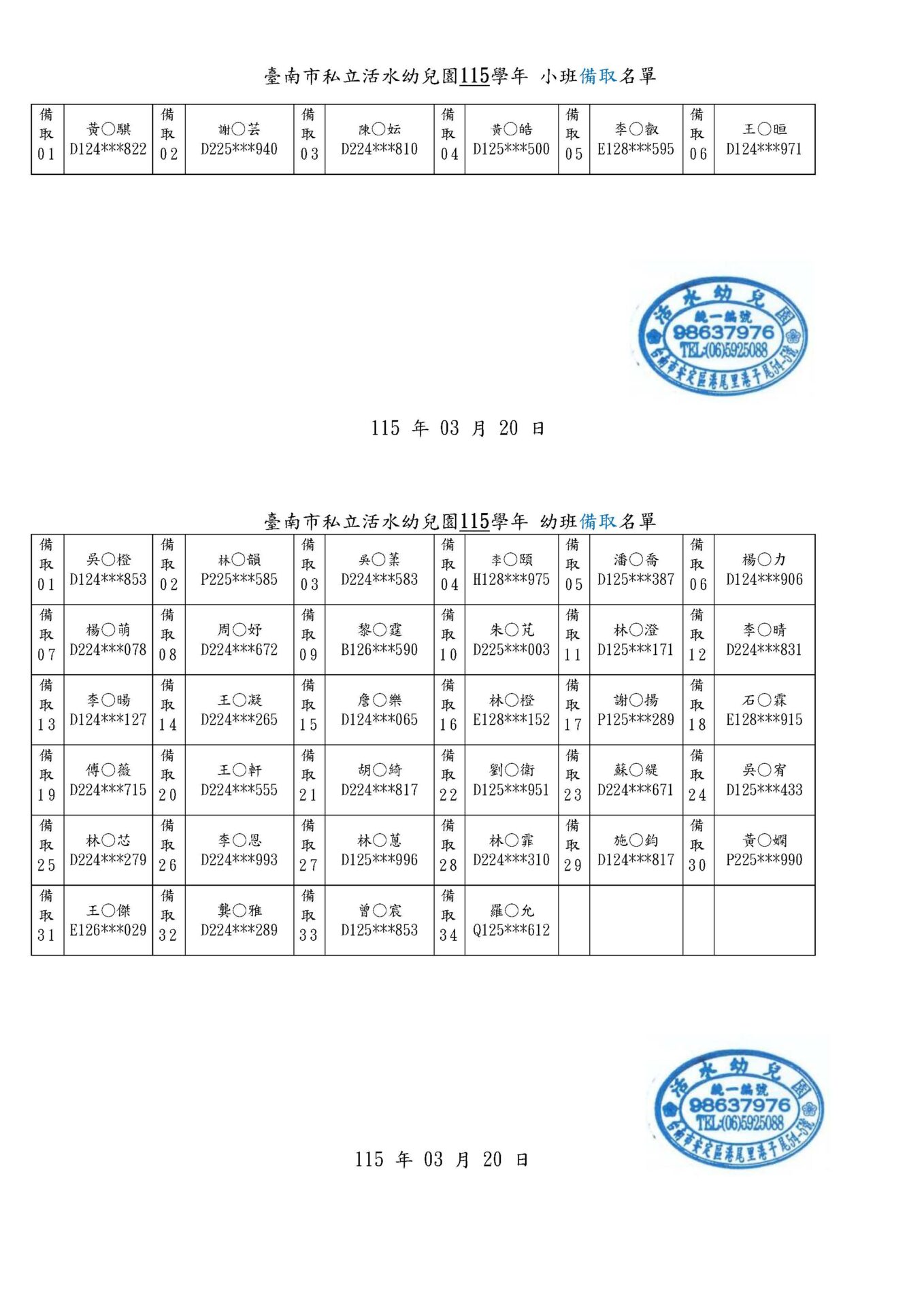 活水幼兒園115學年度新生入園 第二階段正取/備取 名單