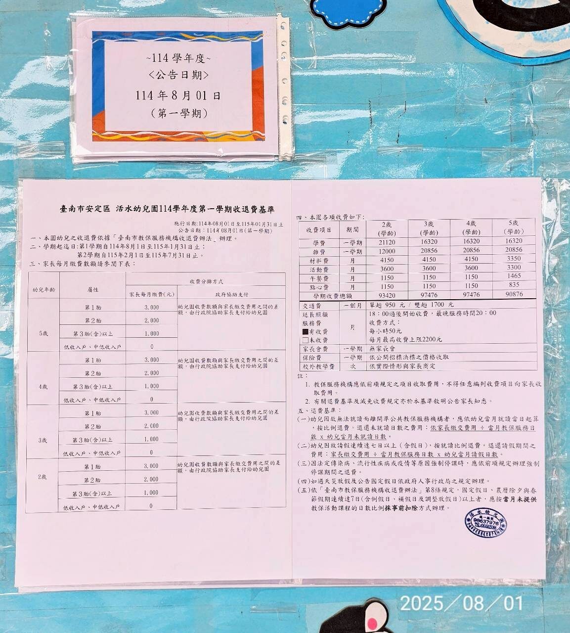 臺南市私立活水幼兒園114學年度收退費基準